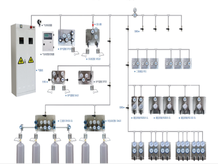 1.系統(tǒng)設(shè)置為二次減壓系統(tǒng)。終端采用壁掛式設(shè)計。上設(shè)有壓力調(diào)節(jié)器、輸出壓力指示計、緊急切斷閥,同一氣路的呈上下對應(yīng)排布,方便操作。面板為不銹鋼產(chǎn)品,具體位置參見圖紙,具體配置情況如下:■壁掛式終端標準型26套注:該終端可以實現(xiàn)在室內(nèi)對設(shè)備的壓力調(diào)節(jié)、輸出壓力的監(jiān)控及氣路開關(guān)控制,省去了每日往返于氣瓶間和實驗間的奔波,提高了辦事效率。